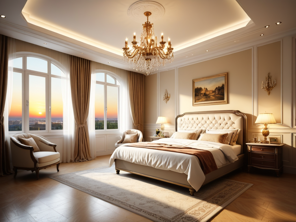 2. **欧式古典风格**:欧式古典风格的卧室窗则更注重细节,窗框多为木质,雕花设计常见。窗户的形状多样,弧形或拱形窗户增添了浪漫气息。窗帘通常选择厚重的布料,搭配华丽的窗帘杆,营造出奢华的氛围。