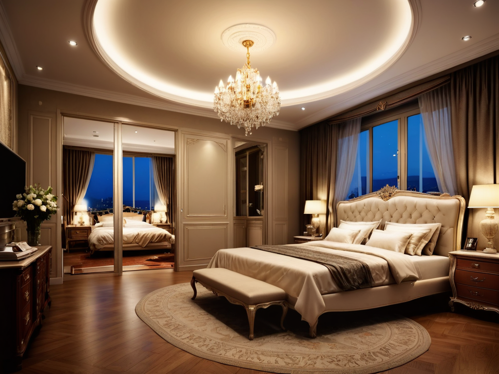 卧室的照明设计应该营造出柔和、舒适的氛围。一般来说,卧室可以分为主光源和辅助光源。主光源可选择吊灯或吸顶灯,提供基本的照明;而辅助光源如床头灯、台灯或壁灯则可以在阅读或休息时使用,增加局部照明。建议采用可调光的灯具,能够根据不同的需求调节亮度,增强卧室的舒适度。灯具的选择也应与整体装修风格相协调,避免突兀。