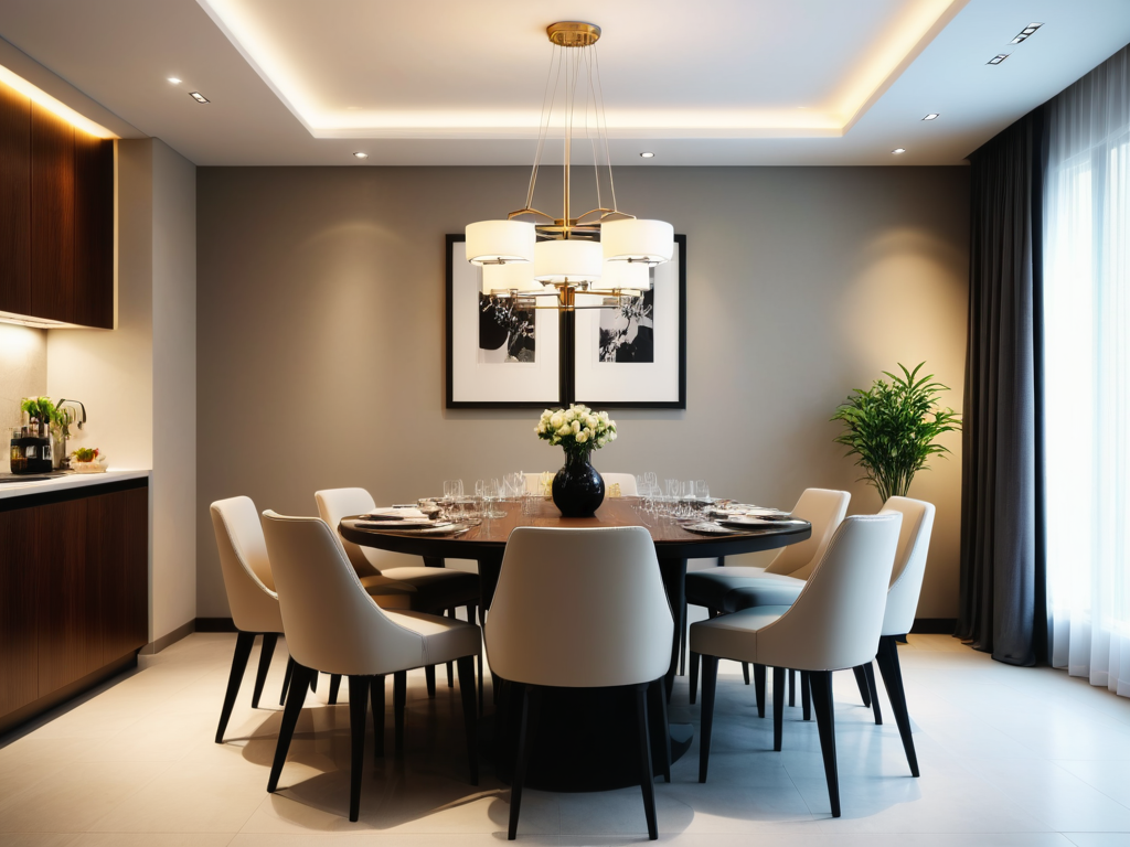 照明设计在现代简约风格中十分重要,应选择简约而有设计感的灯具,如吊灯、落地灯等,以提升空间的美感。同时,需考虑层次感,可以设置主灯与辅助灯,确保整个空间的光线明亮且柔和,避免使用光线过于刺眼的照明。