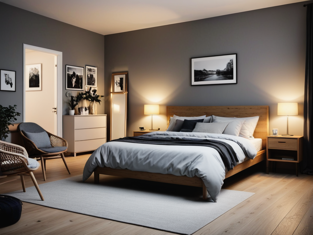 墙面装饰在现代简约风格中通常保持简约,可以选择使用单色涂料或墙纸来营造干净的视觉效果。如果想增加层次感,可以选择一些简约风格的装饰画,或在某一面墙上使用木材或石材进行局部装饰,但需避免过多的装饰元素。
