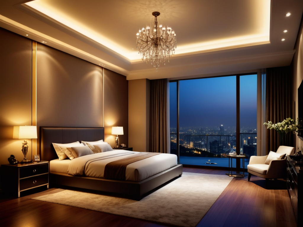 卧室灯光的布置可以采用多层次的方式,既要满足日常照明需求,也要营造氛围。在床头可选择柔和的壁灯或台灯,光线不宜过强,同时也存在装饰效果。主灯可以选用一个设计独特的吊灯,作为空间的视觉焦点。此外,使用调光开关可以根据不同的场景需求调节灯光的明暗,增加空间的灵活性与舒适感。