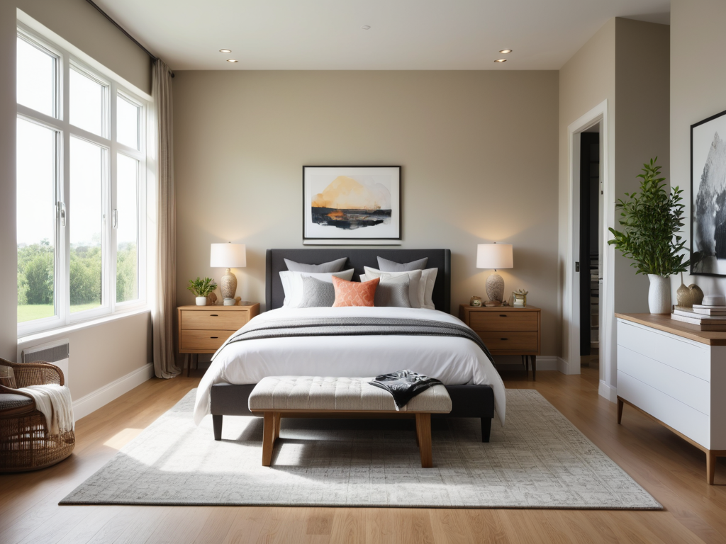 选择现代卧室的家具时,应注重简约与功能性。以功能齐全的家具为主,避免过多的装饰。床、衣柜和书桌是卧室的基本家具,建议选择线条简洁、材质优良的家具,如实木或合成板材。同时,颜色上可以选择与墙面和谐的色调,保证整体风格一致。