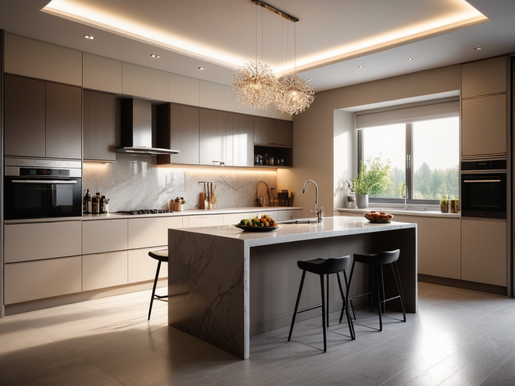 厨房的照明设计需兼顾功能与美观。一般来说,应该选择明亮的主灯作为基础照明,同时在操作台面上方安装聚光灯,确保足够的光线供切菜和烹饪使用。此外,利用灯带装饰橱柜底部也可以增加空间的层次感和温馨感。