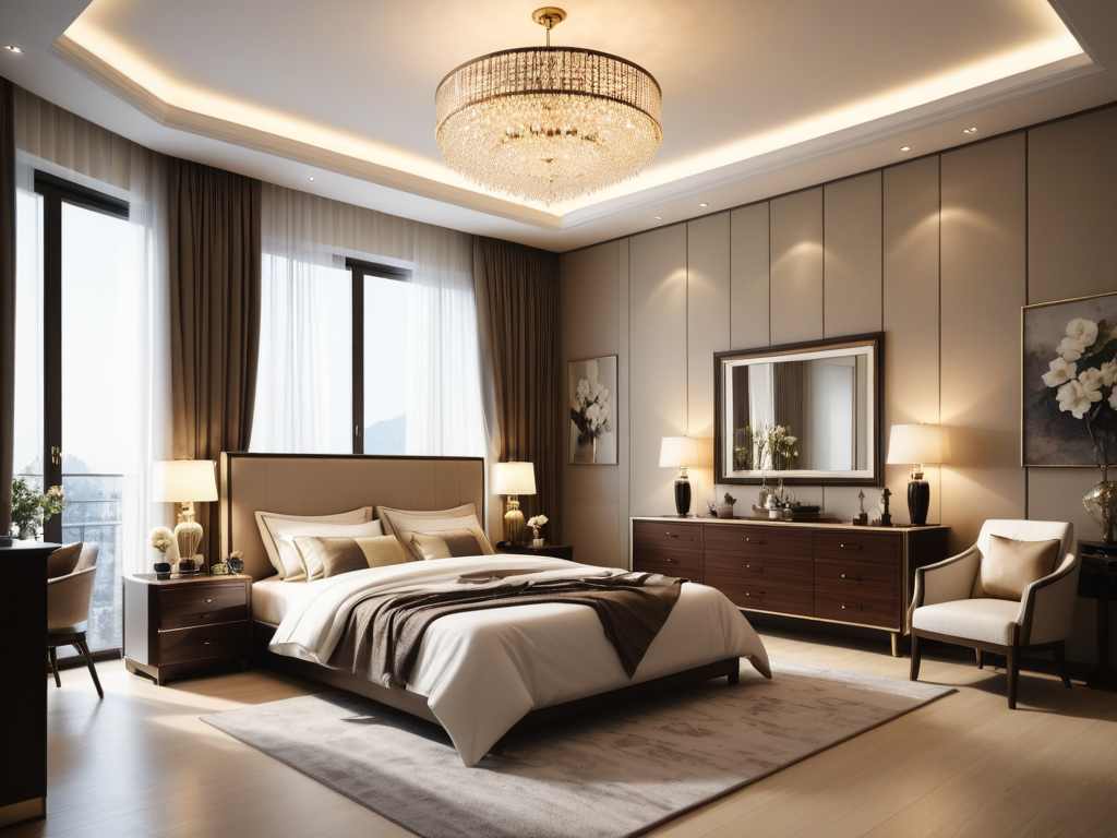 中式家装中的灯光设计应以柔和、暖色调为主。可以选择古典的吊灯、壁灯或地灯,并结合窗户的自然光,创造出温馨的居家氛围。在灯具选择上,注重与整体装修风格的统一。