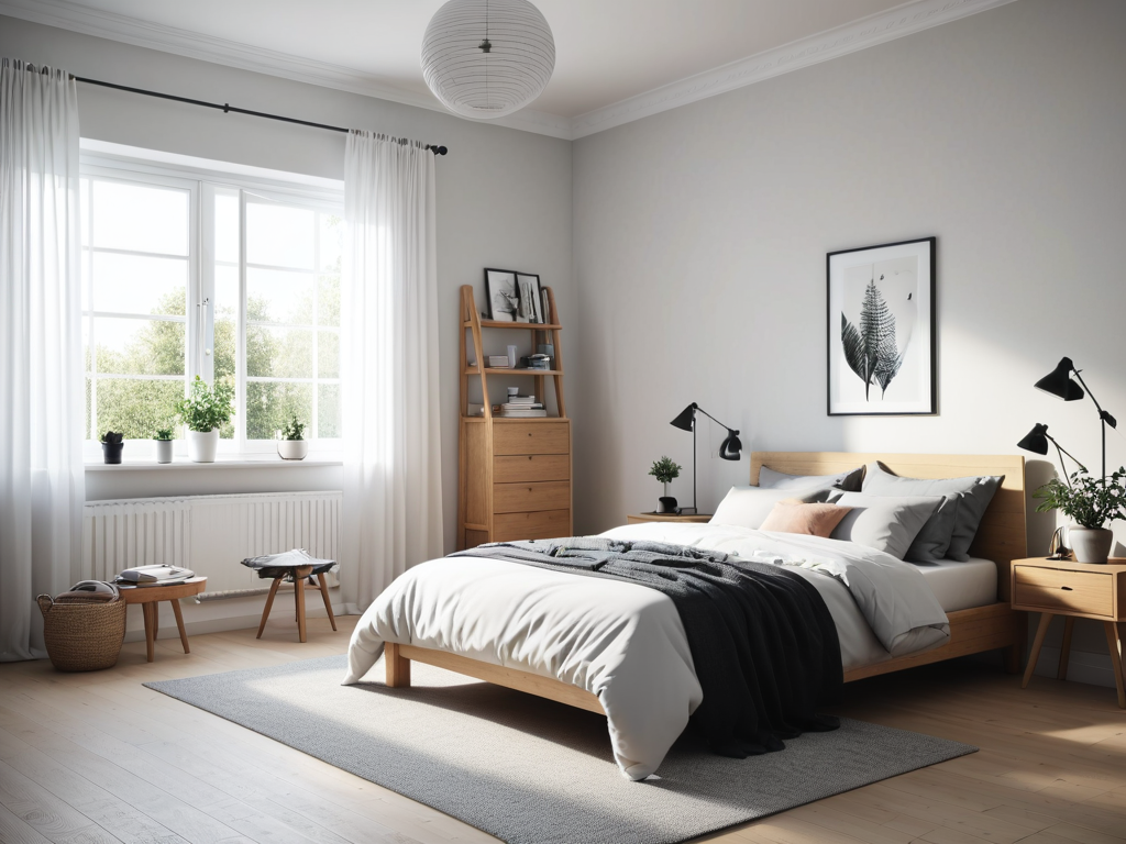 在北欧风格的主卧中,可以使用一些自然元素和简约的装饰品。例如,挂画、绿植、手工编织的地毯和靠垫等。建议选择与整体色调相协调的装饰品,避免使用过于复杂的图案。此外,使用自然材质的装饰品,如陶器和木质摆件,能够增添空间的温暖感。