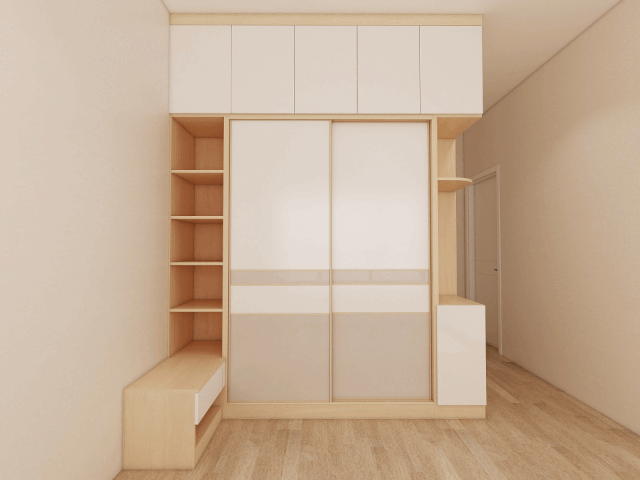 衣柜+床头柜:业主原计划直接购买成品的两门封闭衣柜和床头柜,但是考虑到床沿至墙的间距较为窄小,床头柜势挡住衣柜开合,拿取不方便。设计师为此设计了一套衣柜+床头柜的组合柜,以此来解决两个柜体相互冲突的问题。