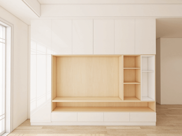 电视机柜: 日常生活中,客厅需要储藏一家人的公用物品,收纳需求大,所以我们收纳功能更加强大的一体柜,来代替传统的电视机矮柜。