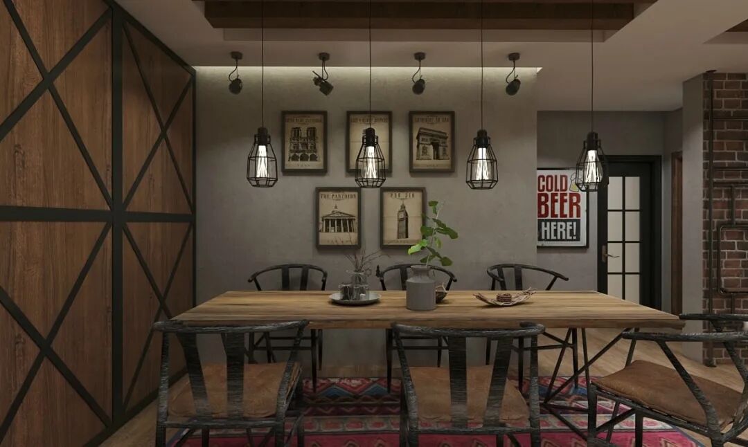 与客厅一致,工业风餐厅同样为背景墙打造出斑驳与粗糙感,再用简单的饰品进行随意修饰,整体的温度降低了,空间质感却大大提升,兼具复古与时尚风情。
