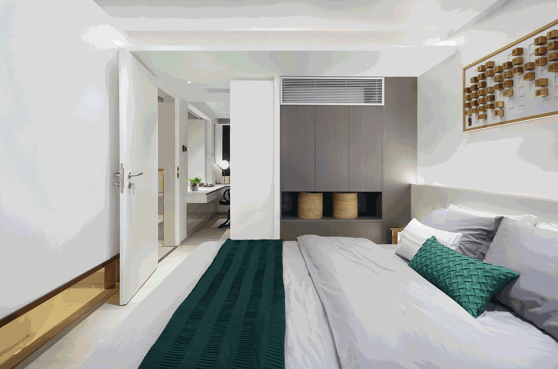 穿过通道,就是位于偏间的四儿子夫妇的区域,前侧为卧室,后侧为一个半开放式的书房。整个区域既可以完全对外封闭成为一个东西通透独立的内部空间,也可以单独将卧室封闭,将书房敞开单独使用。